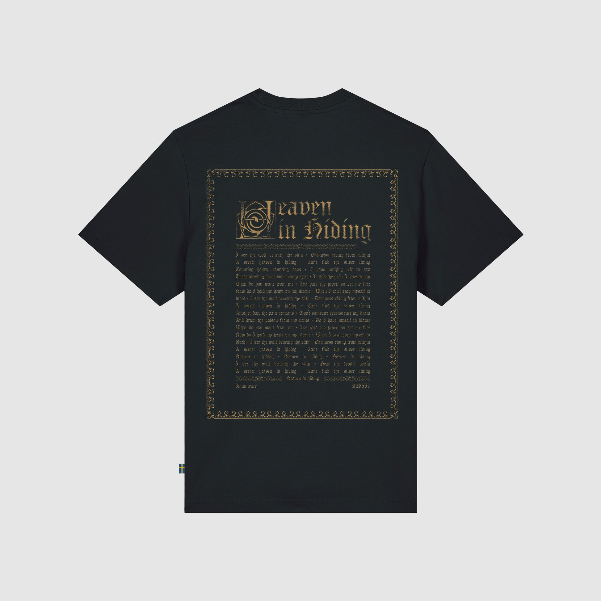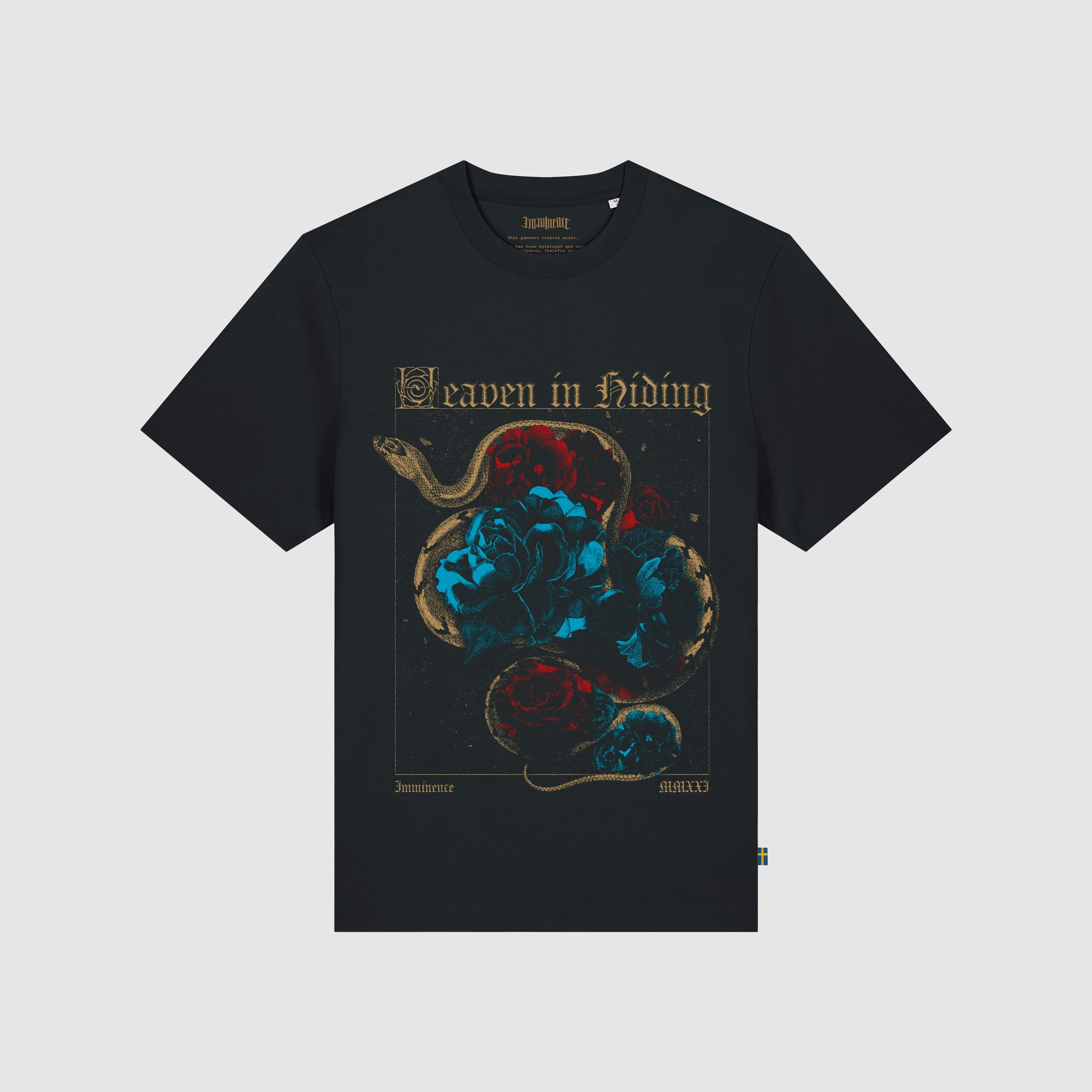 Black, organic unisex relaxed Imminence Heaven in Hiding T-shirt. Featuring a snake and rose print and the album title on the front; a large lyric print on the back; an inside nape manifesto and a woven Swedish flag tag.