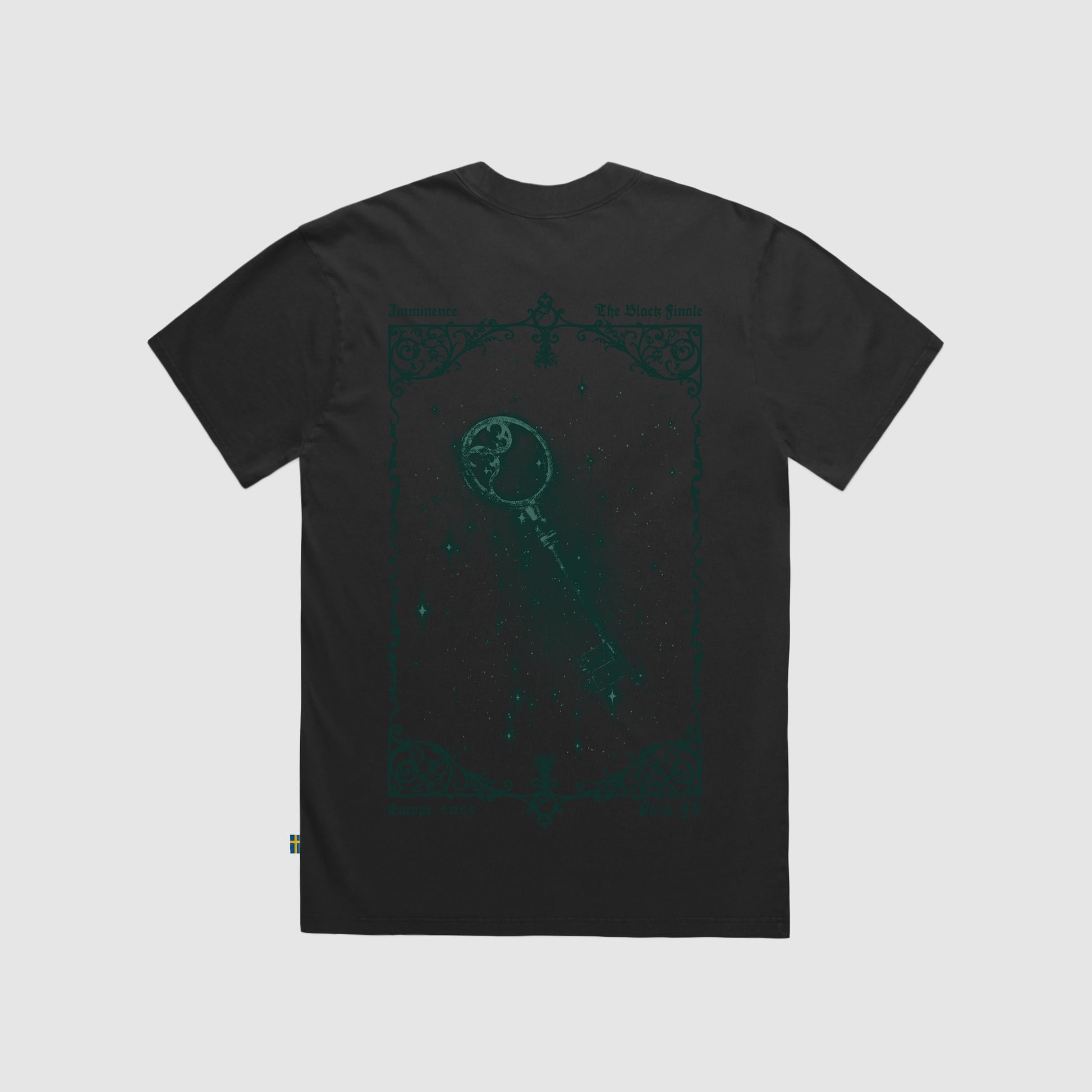 Faded black, heavy weight oversized limited edition Imminence T-shirt from The Black Finale show in Paris. Featuring an angel and landmark artwork on the front with the Imminence ambigram logo and city name; a key with the tour name and date on the back; an inside nape manifesto and a woven Swedish flag tag.
