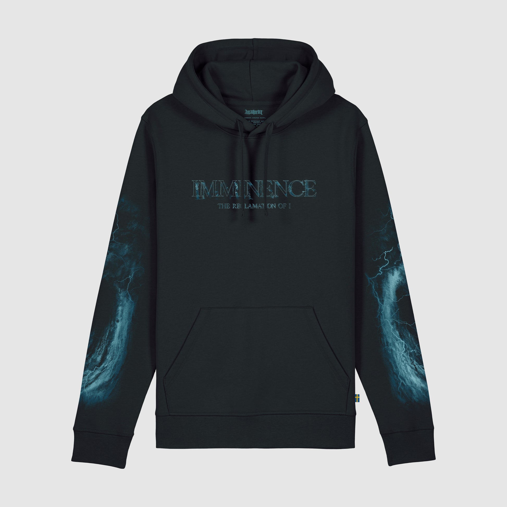 Black, organic Imminence Hoodie inspired by the album The Reclamation of I. Featuring a front print of an Imminence font logo and the album title; a large back print of a stormy ocean with the band name, album title and tracklist; water and lightning on the sleeves; an inside nape manifesto and a woven Swedish flag tag.