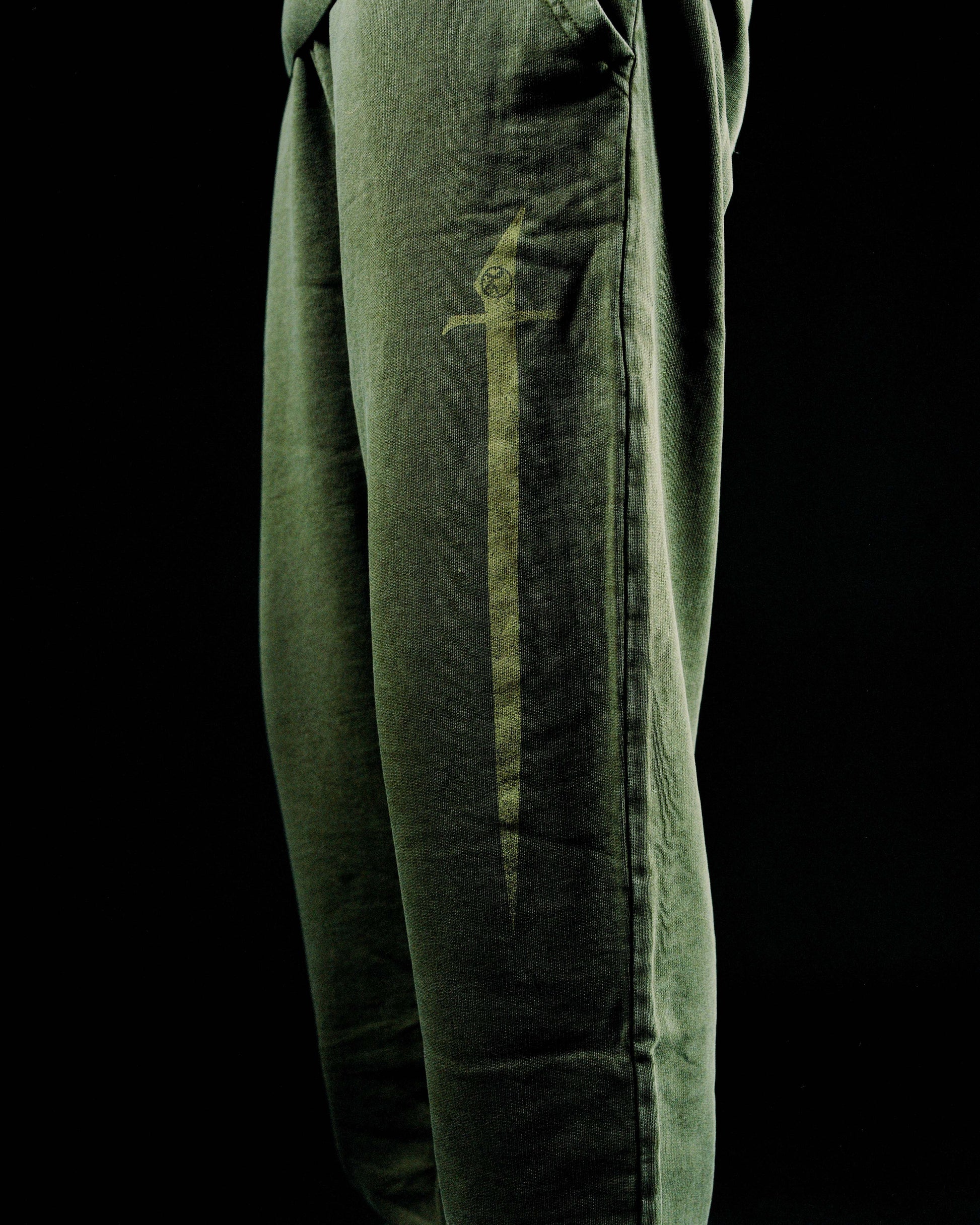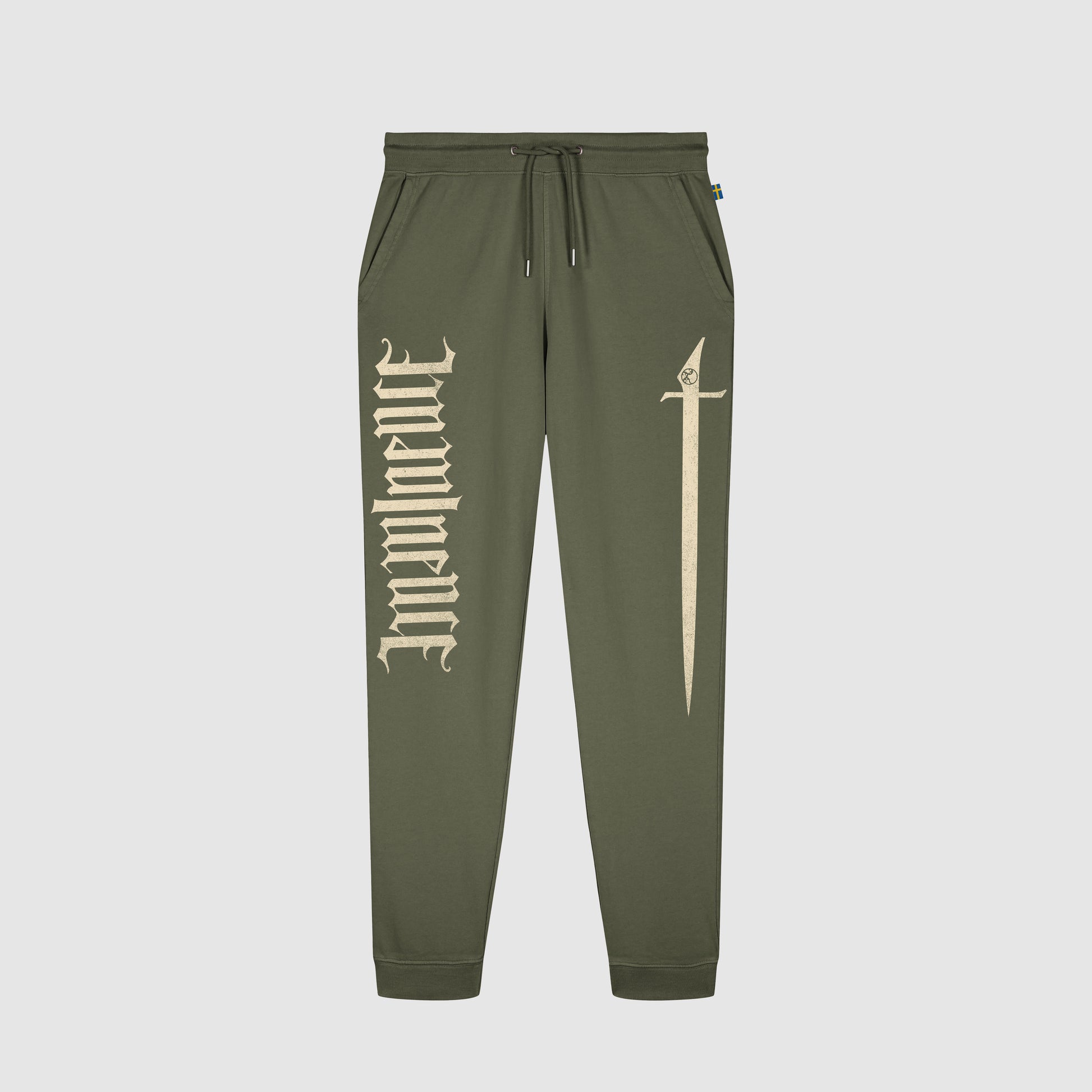 Vintage washed, dyed khaki organic Imminence trousers inspired by Death by a Thousand Cuts. Featuring the Imminence ambigram logo; a sword with the song symbol and a woven Swedish flag tag.