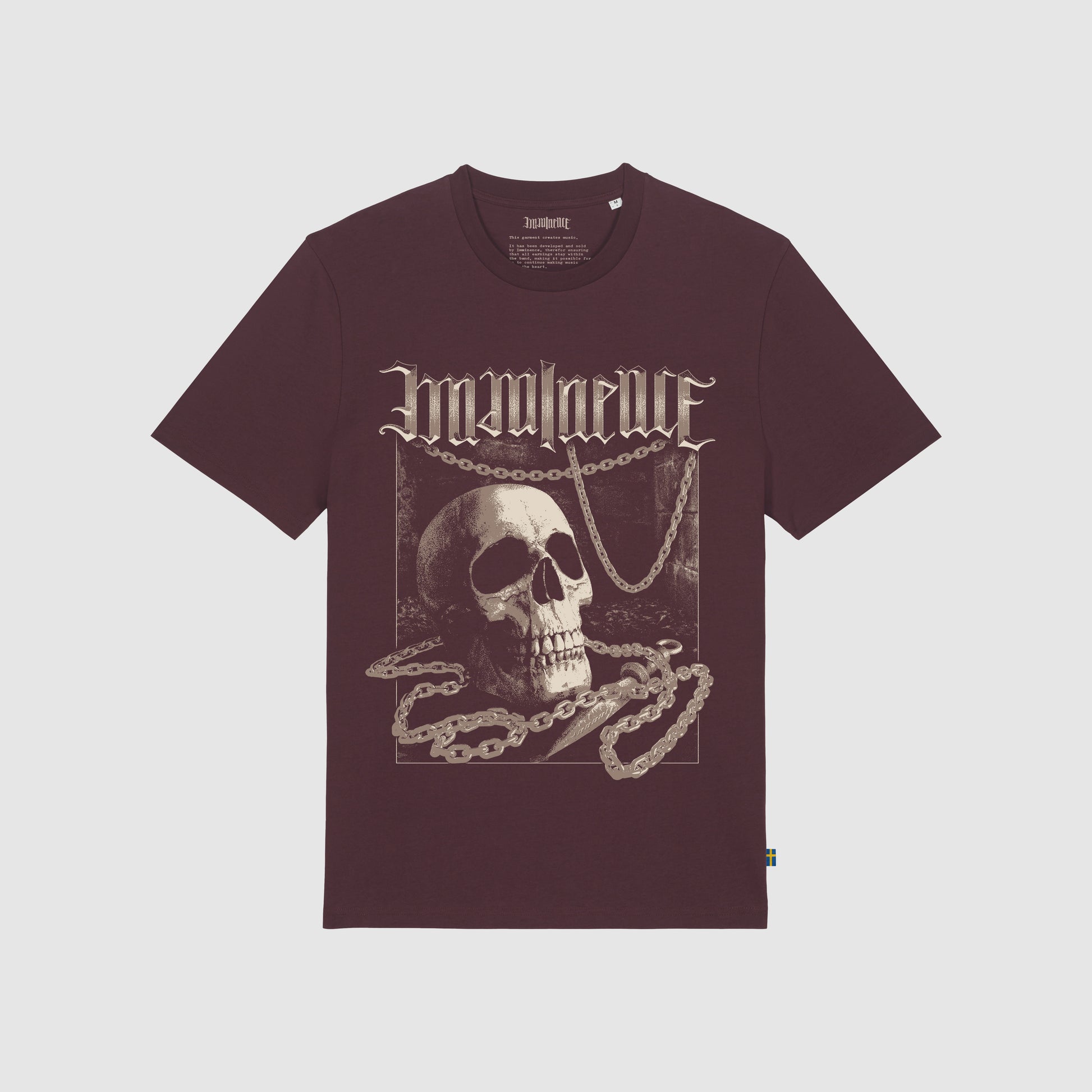 Red brown, organic Imminence T-shirt inspired by the song Death Shall Have No Dominion. Featuring a front print of a skull with chains and the Imminence ambigram logo; a large lyric print on the back; an inside nape manifesto and a woven Swedish flag tag.