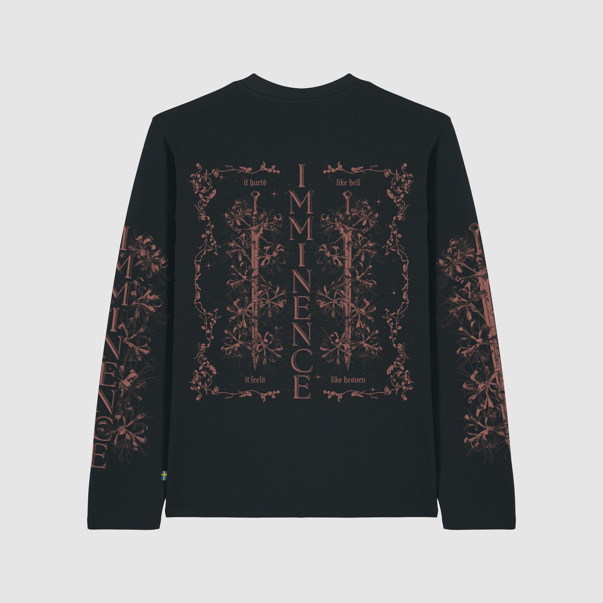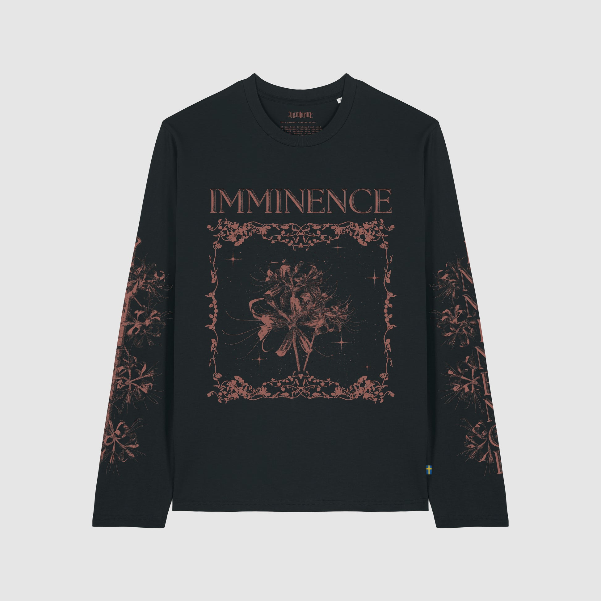 Black, organic unisex Imminence longsleeve shirt inspired by the song God Fearing Man. Featuring a floral print on the front together with the band name; sleeve prints; swords and floral print with lyrics on the back; an inside nape manifesto and a woven Swedish flag tag.