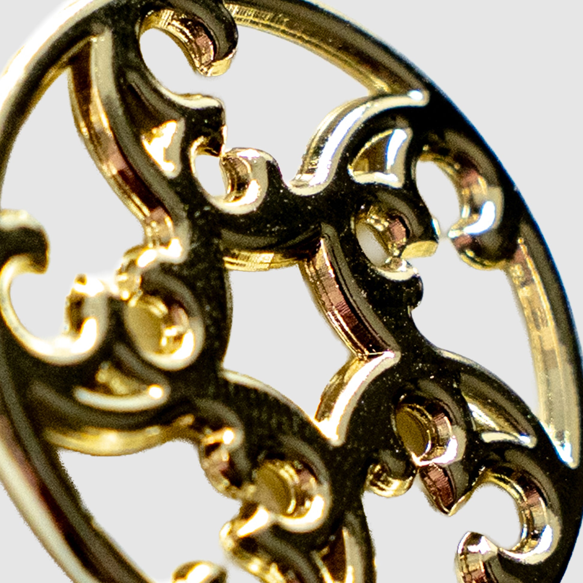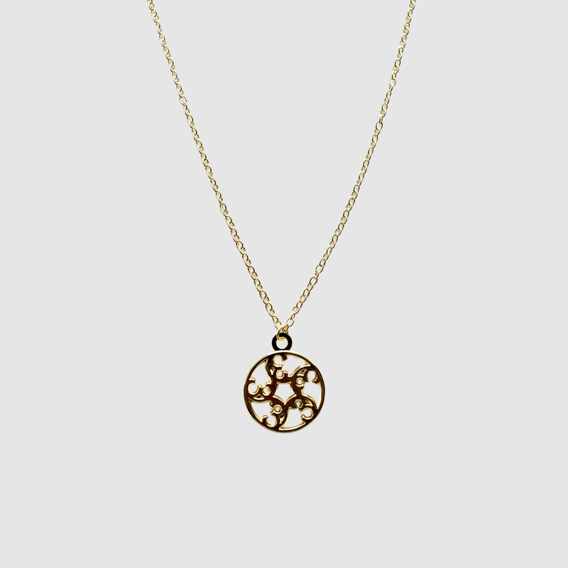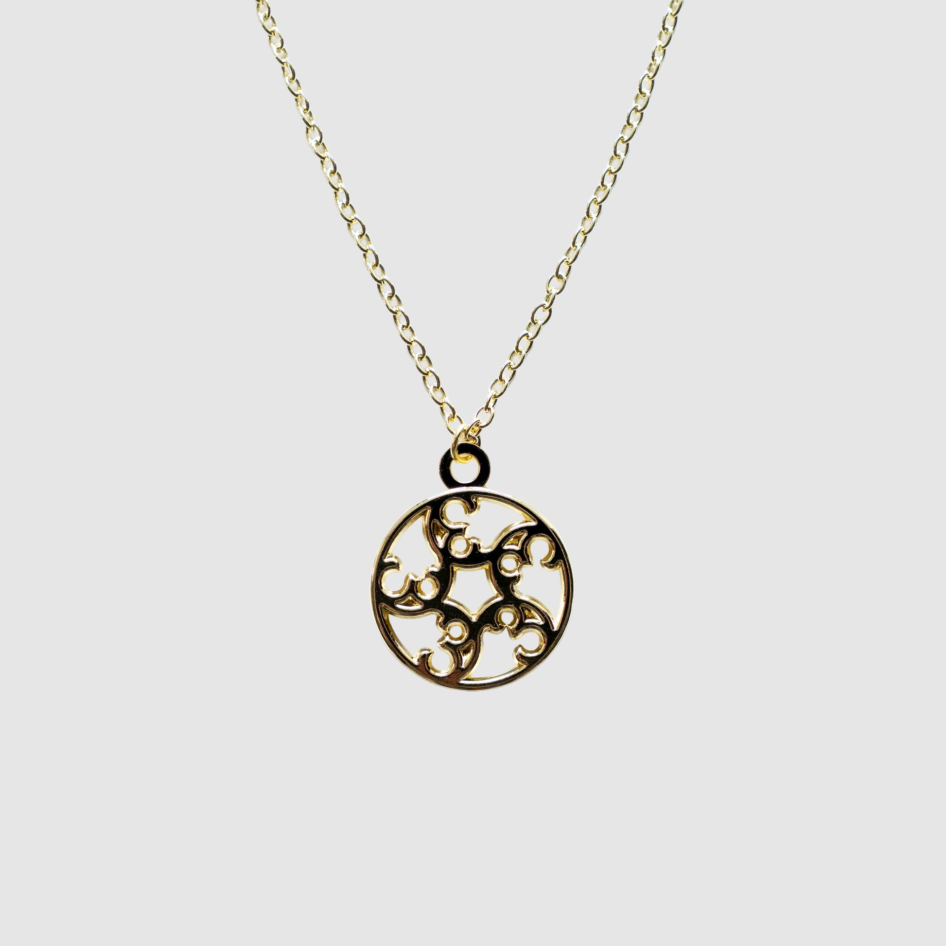 Gold colored Imminence necklace with The Black symbol charm. The charm is 3cm/1.2" wide and the chain is 47cm/18.5" long with small rings for attachment to the chain. Includes a black velvet bag with a symbol print.