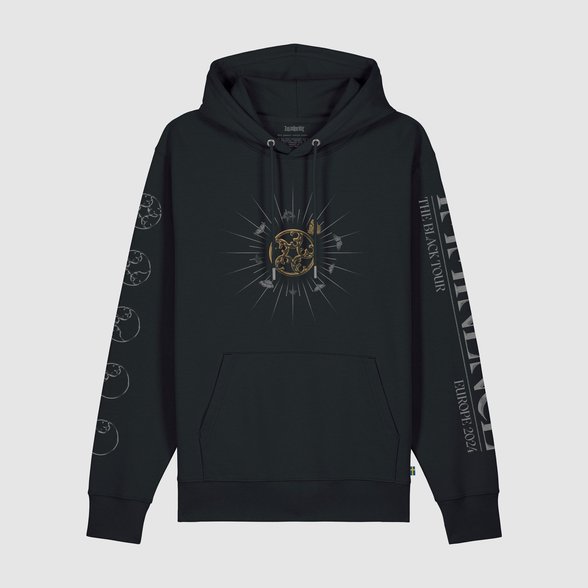 Black, organic Imminence hoodie from The Black Tour: Europe. Featuring the album symbol surrounded by moths; a large motif on the back with tour dates; a set of the album symbol on the right sleeve; the band and tour name on the left sleeve; an inside nape manifesto and a woven Swedish flag tag.