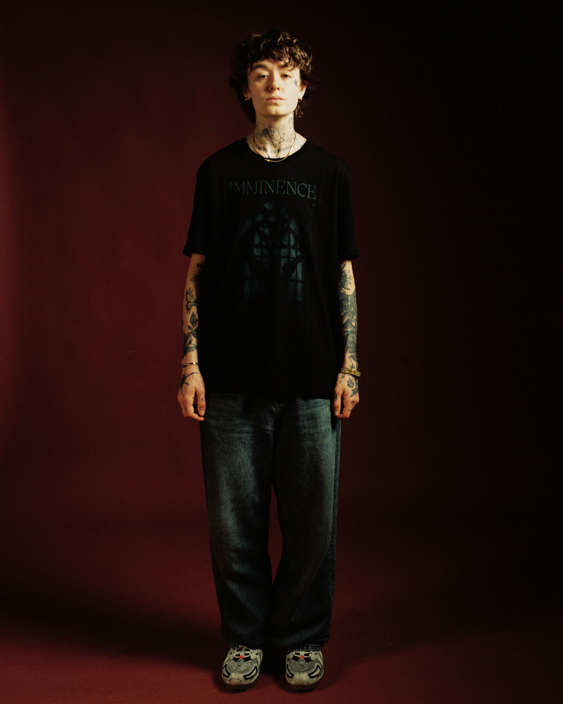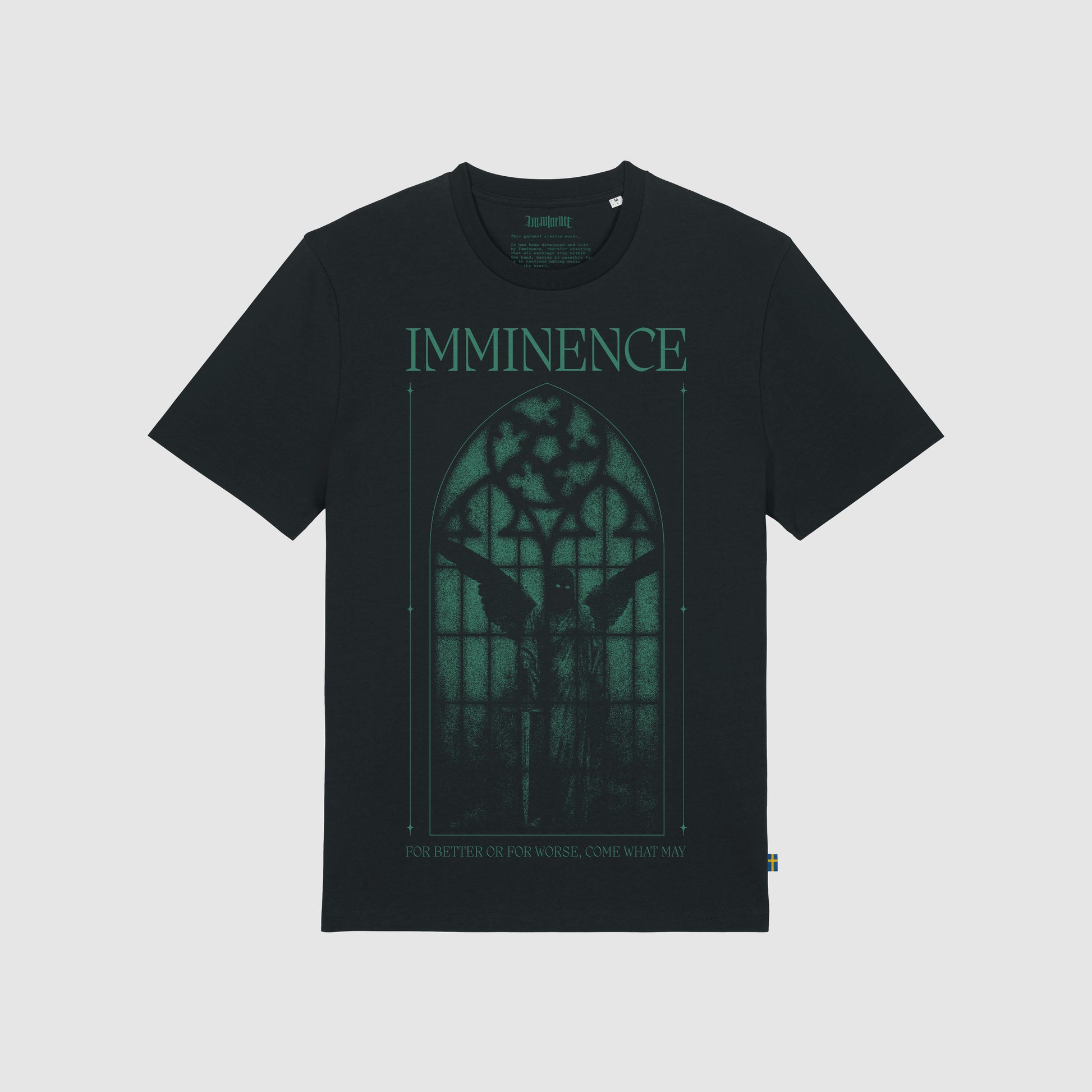 Black, organic Imminence T-shirt inspired by the song Come What May. Featuring a large front print with an ominous angel behind a gothic church window with the album symbol, an Imminence print and lyrics from the song; an inside nape manifesto and a woven Swedish flag tag.