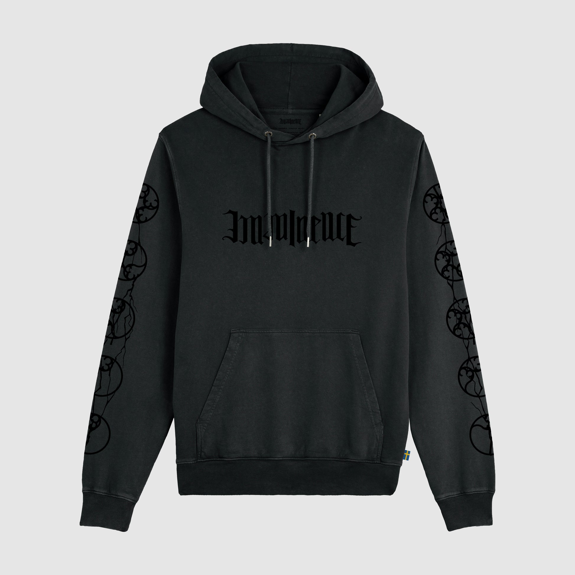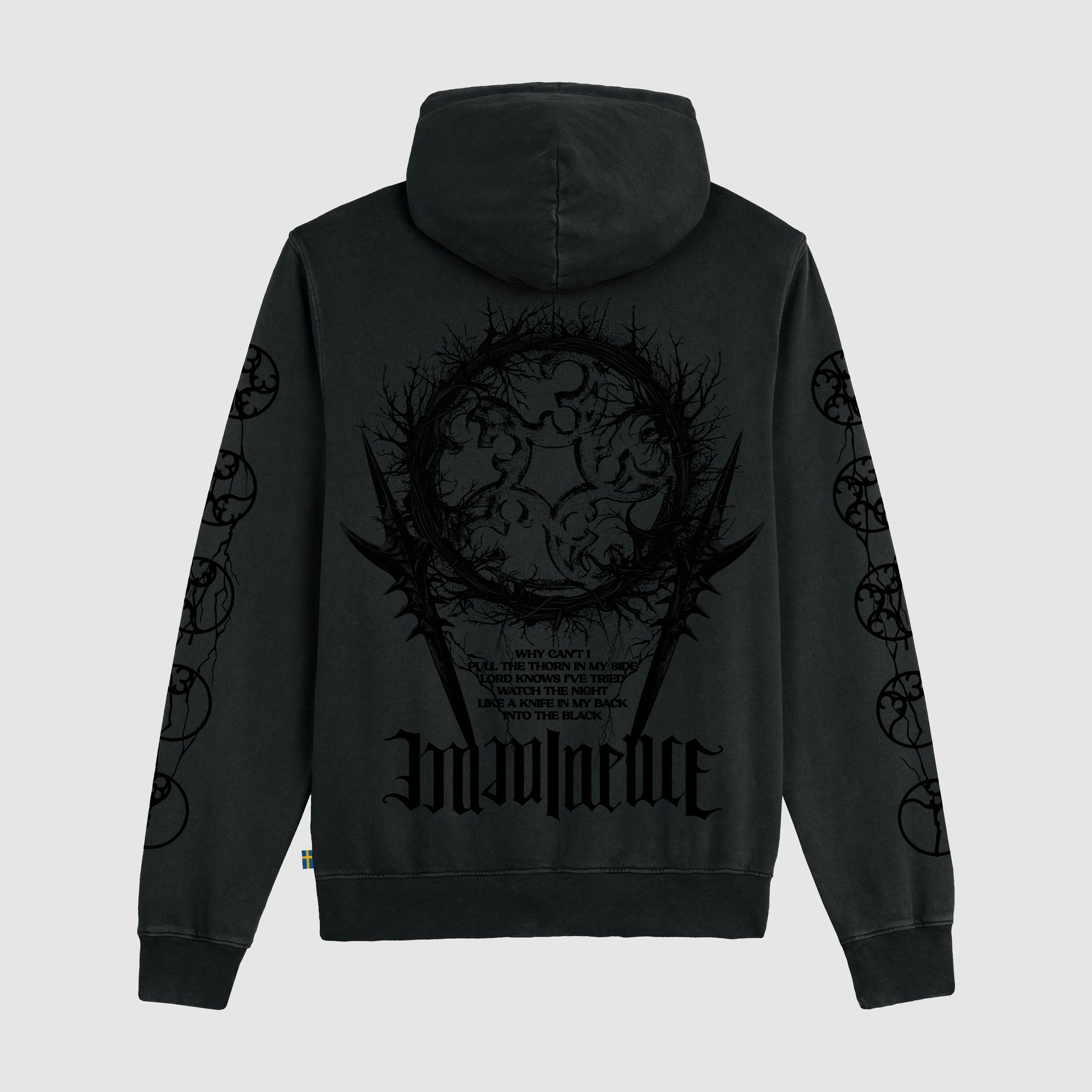 Vintage washed, black rock organic Imminence hoodie inspired by The Black. Featuring the Imminence ambigram logo on the front; a large motif with lyrics, album symbol and Imminence logo on the back; the black logo surrounded by lightning on the sleeves; an inside nape manifesto and a woven Swedish flag tag.