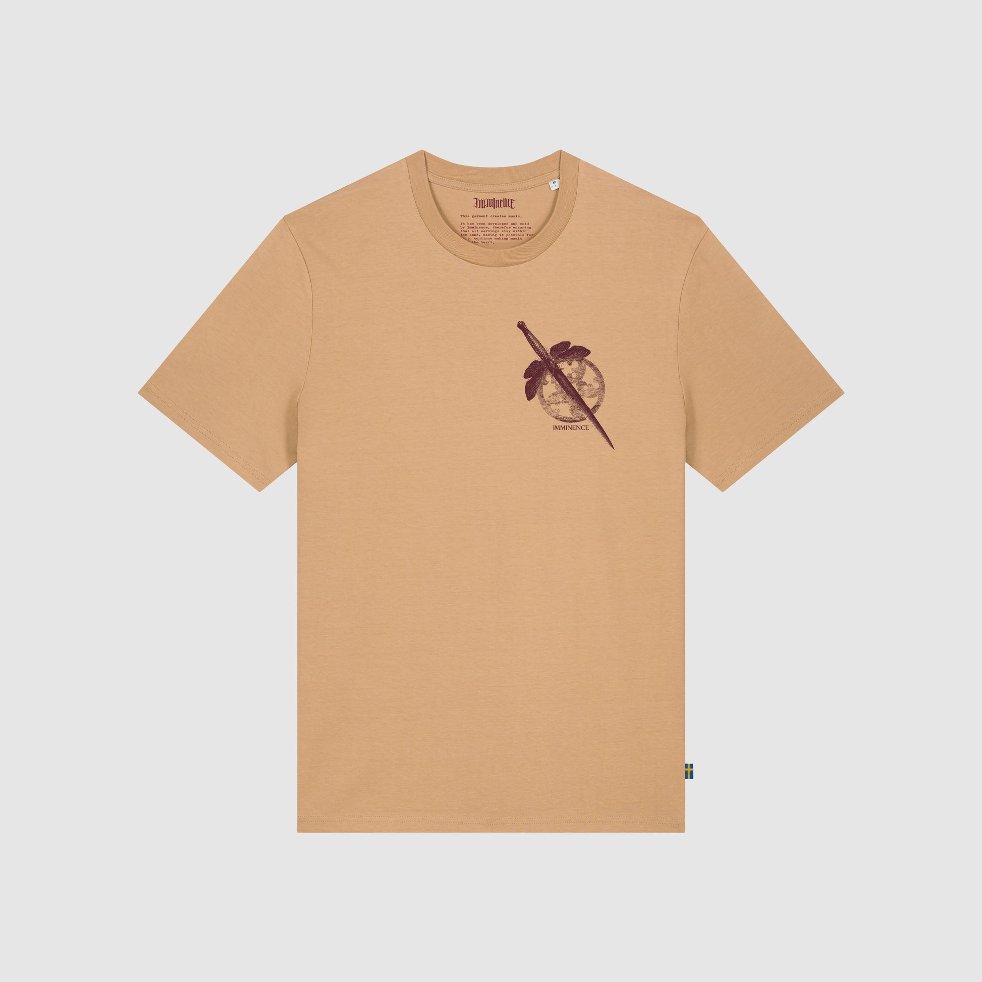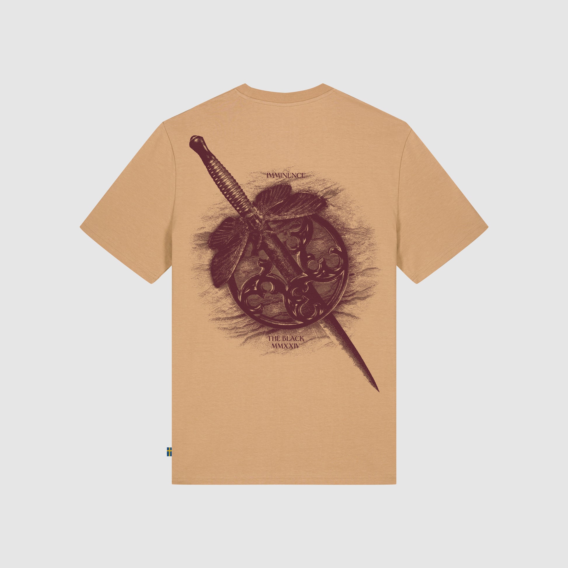 Beige, organic Imminence T-shirt inspired by symbolism from The Black. Featuring a front and back print of a moth knife over the album symbol; an inside nape manifesto and a woven Swedish flag tag.