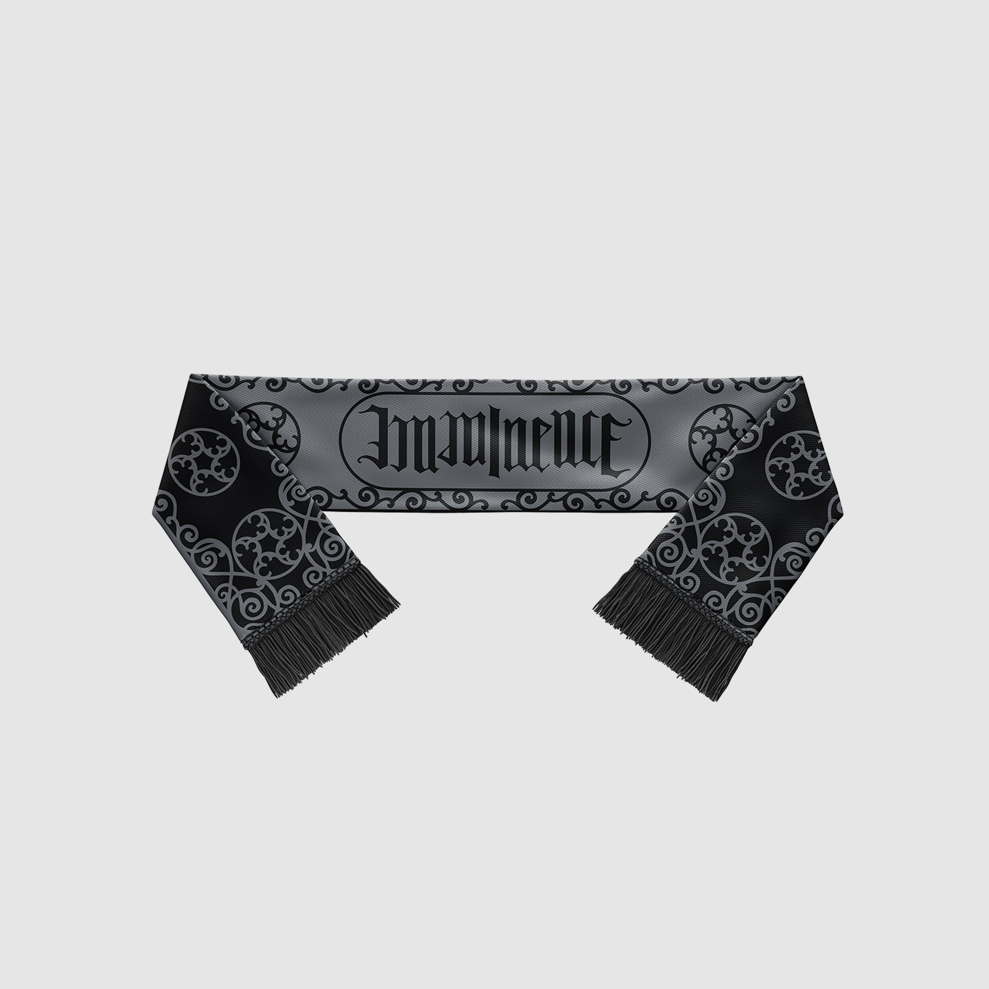 Black and gray knitted Imminence scarf with an inverted motif. Featuring The Black album symbol and the Imminence ambigram logo; and a woven Swedish flag tag.